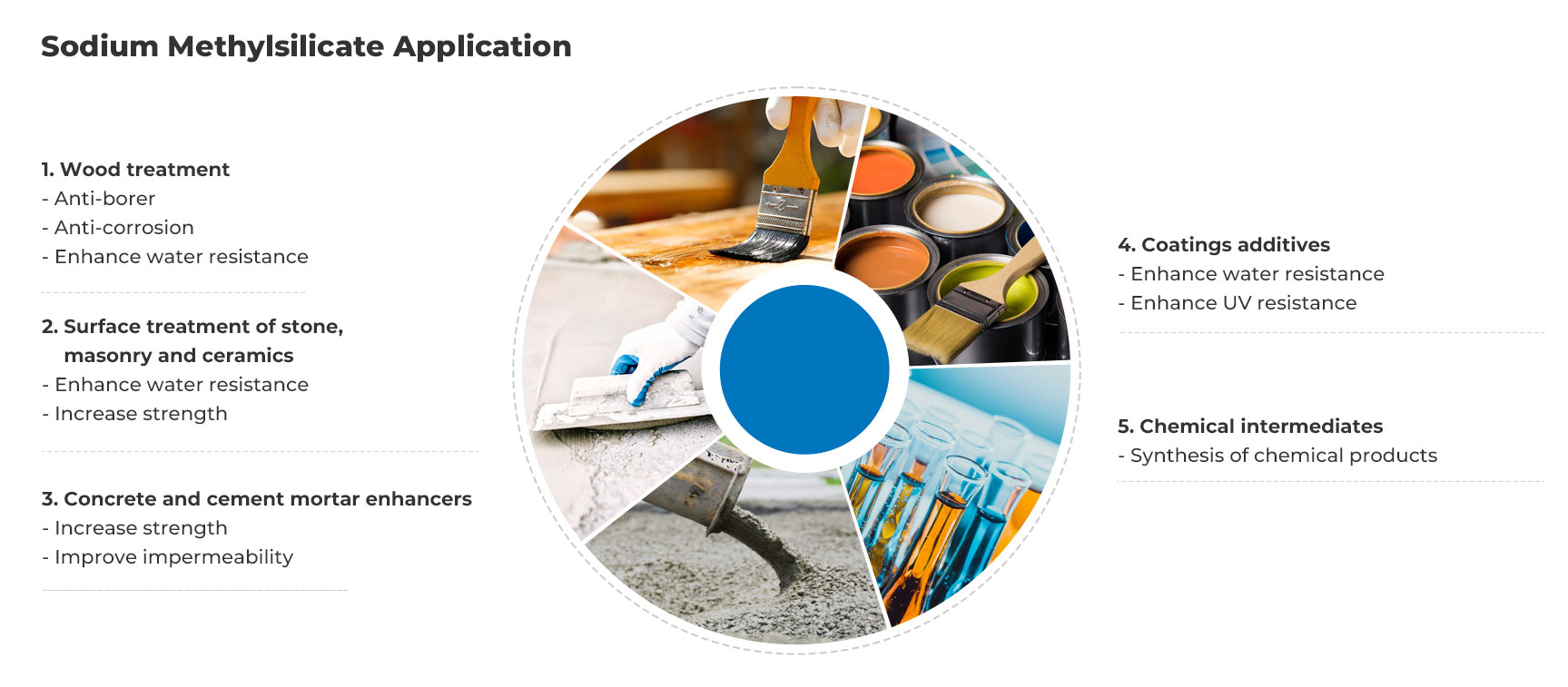 Med disse utmerkede egenskapene har natriummetylsilikat brede bruksmuligheter på mange felt. Innen konstruksjon kan den brukes til vanntetting av yttervegger, tak, kjellere og andre deler av bygninger, effektivt forhindrer regnvannslekkasje og beskytter bygningsstrukturen. For å ta et høyhus som et eksempel, etter å ha brukt natriummetylsilikat til vanntetting av ytterveggene, etter år med kraftig regn, var det ingen lekkasje på veggen, og klagefrekvensen fra beboere falt betydelig. Ved renovering av gamle boligområder ble det brukt natriummetylsilikat for å vanntett taket, noe som forlenget takets levetid betydelig. ?